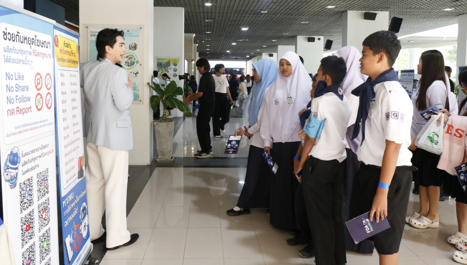 กิจกรรมครั้งนี้จัดในรูปแบบ Interactive Learning ผ่านกิจกรรม Talk Show โดย แพทย์หญิงลลนา ก้องธรนินทร์ หรือ “หมอเจี๊ยบ” มาร่วมถ่ายทอดประสบการณ์และให้ความรู้ด้านการดูแลสุขภาพอย่างถูกต้อง พร้อมแนะนำแนวทางการเลือกใช้ผลิตภัณฑ์สุขภาพอย่างเหมาะสม พร้อมกิจกรรมฐานการเรียนรู้ 4 ฐาน มุ่งเน้น “รู้จริง ใช้เป็น” ได้แก่ เลข อย. ผิด ชีวิตเปลี่ยน, อ่านฉลากให้เป็น เลือกกินให้ถูก ลดหวาน มัน เค็ม, ช่วยกันหยุดโฆษณาผลิตภัณฑ์สุขภาพที่ผิดกฎหมายด้วยปลายนิ้ว และการติดตามข้อมูลข่าวสารผ่าน FDA Channel โดยมีนักศึกษาเข้าร่วมกว่า 200 คน สะท้อนพลังความตื่นตัวของคนรุ่นใหม่ต่อประเด็นความปลอดภัยด้านสุขภาพ